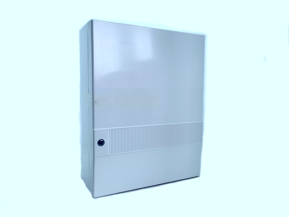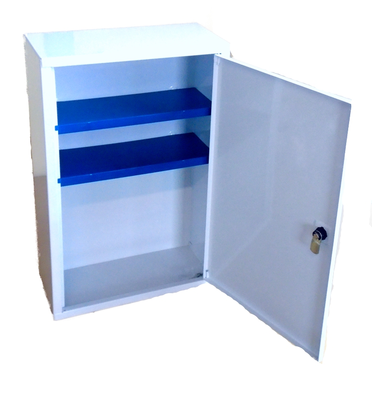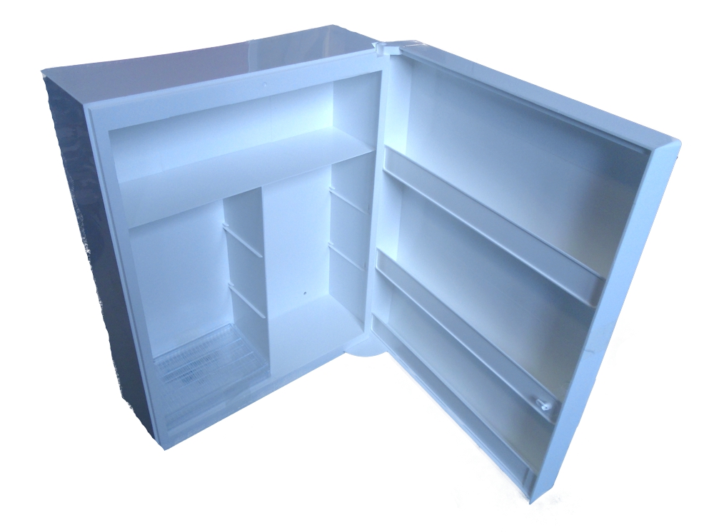 Erste-Hilfe Schrank leer aus Kunststoff.